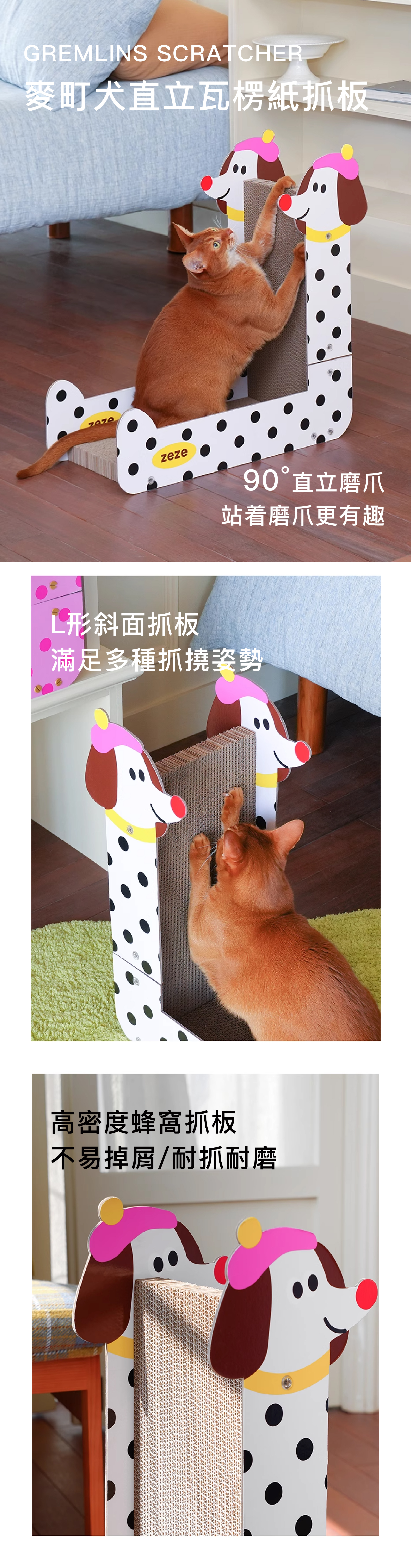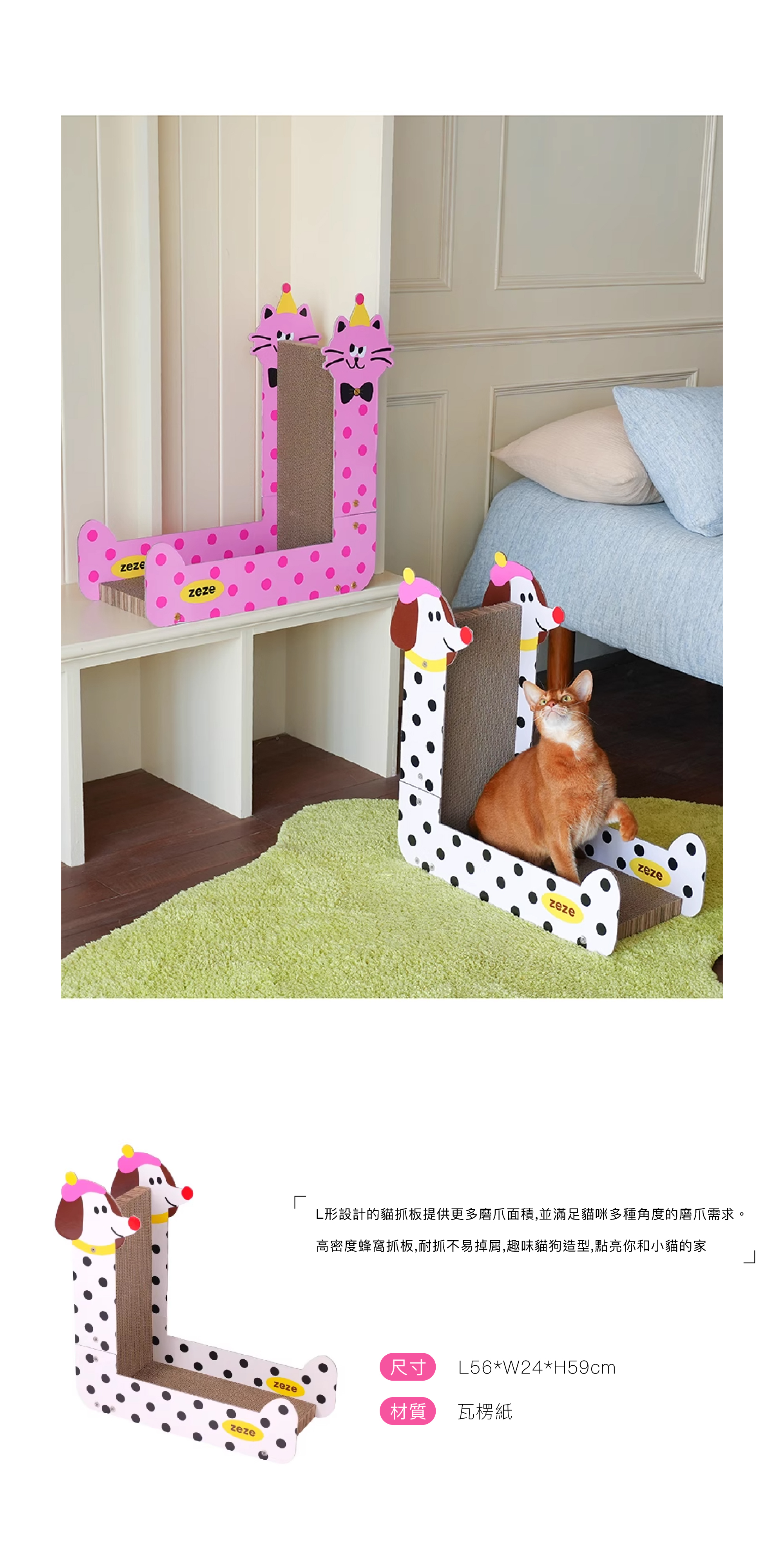 搗蛋貓與麥丁犬來襲〜L形設計的貓抓板提供更多磨爪面積,並滿足貓咪多種角度的磨爪需求。高密度蜂窩抓板,耐抓不易掉屑,趣味貓狗造型,點亮你和小貓的家