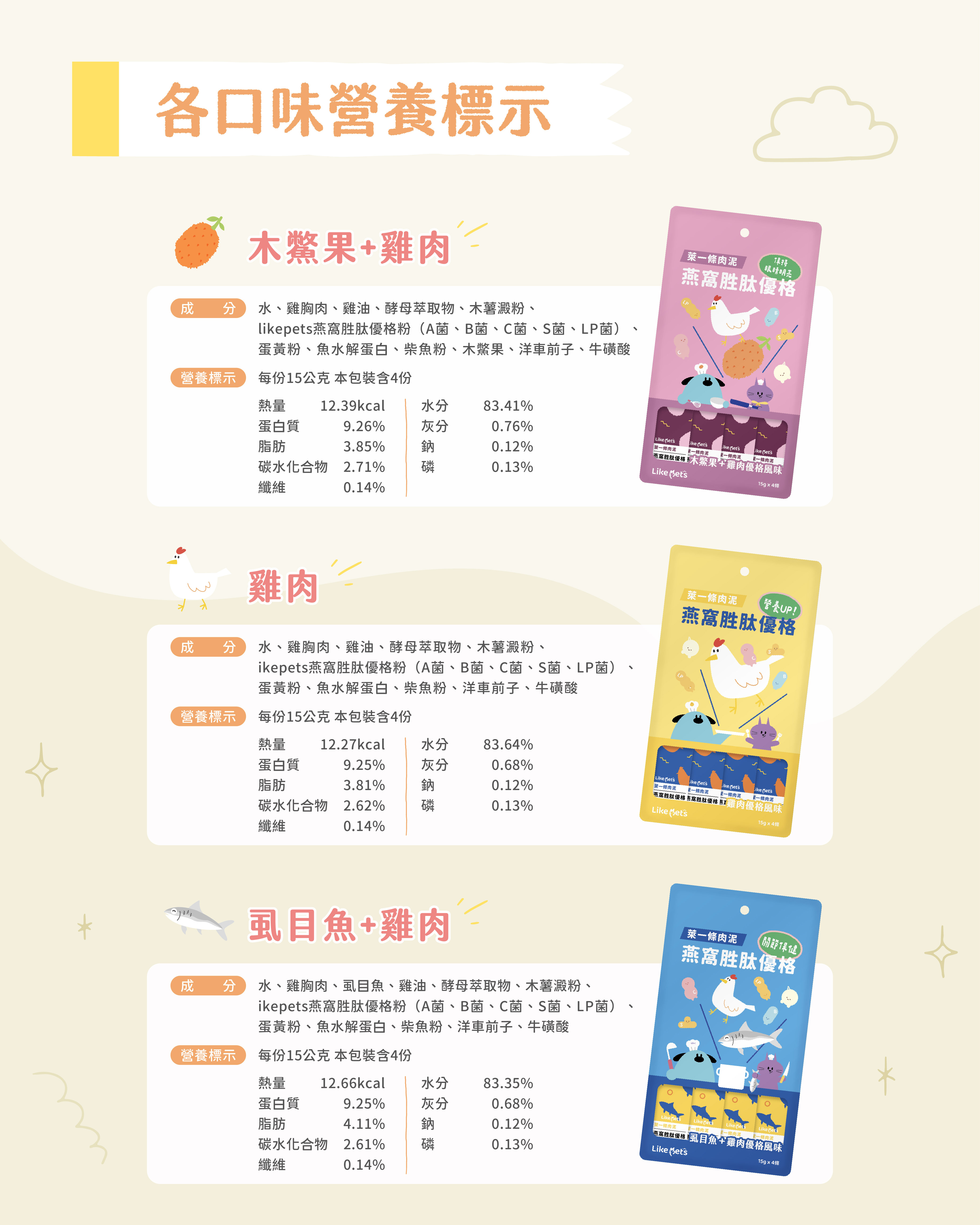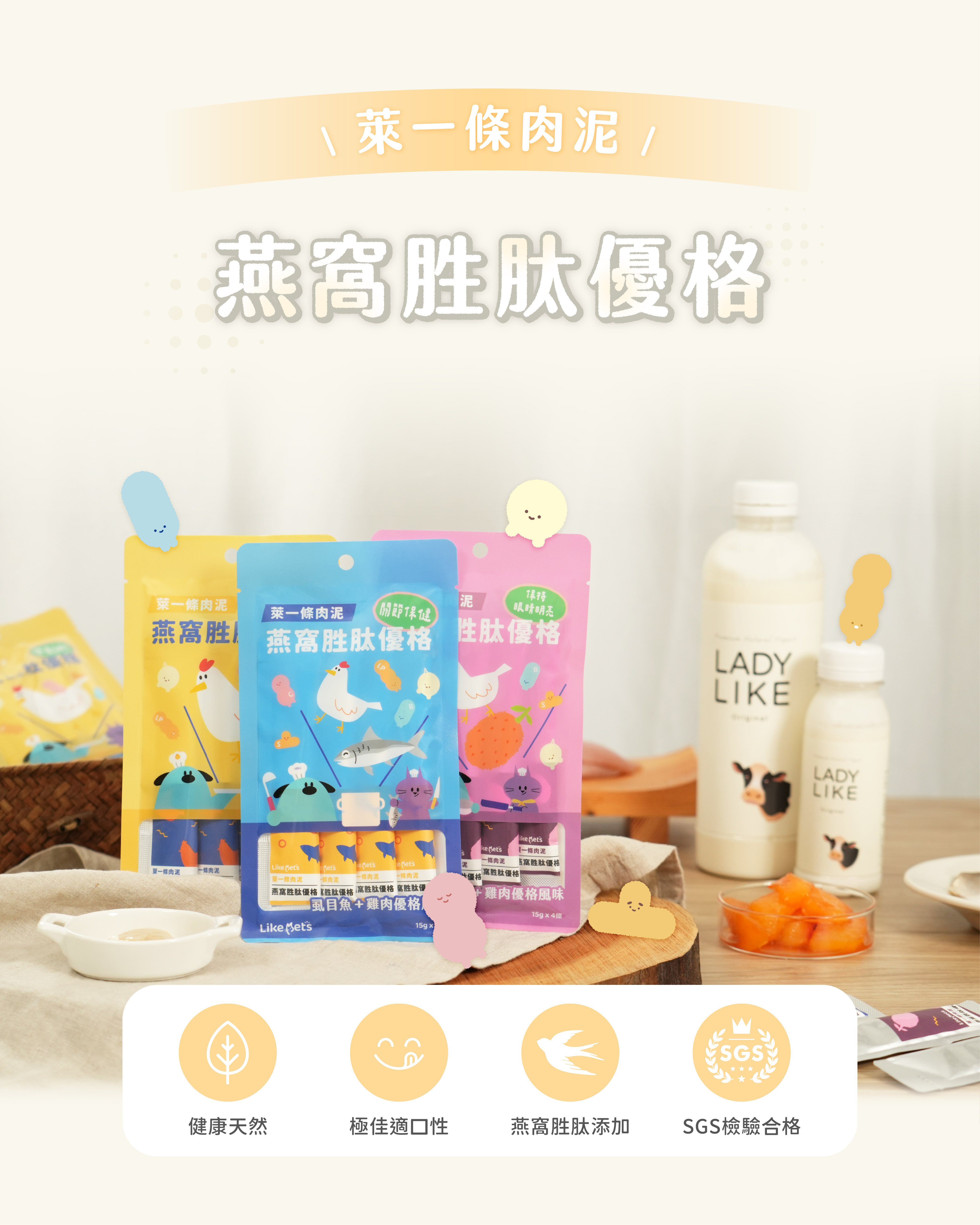 嚴選雞胸肉,低脂高蛋白,搭配優格與燕窩胜肽,幫助腸胃吸收、維持免疫力,是全齡毛孩的溫和營養補給。