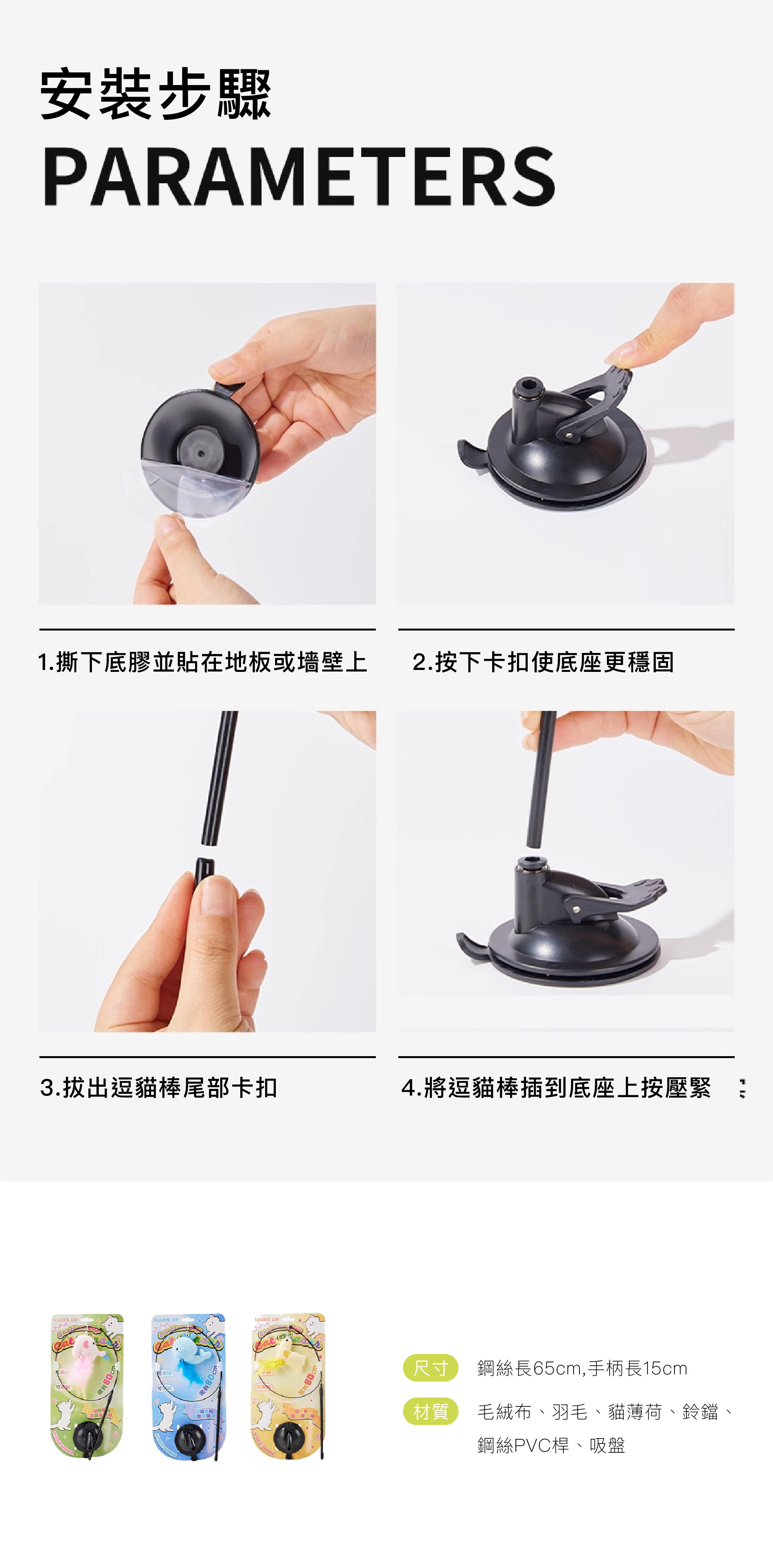 -材質:毛絨布、鈴鐺、貓薄荷、羽毛、PVC桿、鋼絲、吸盤